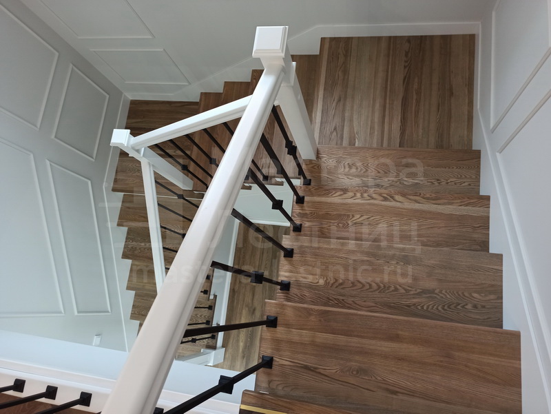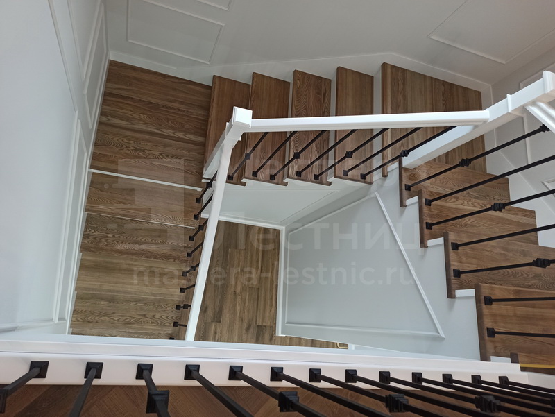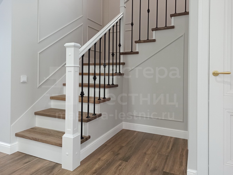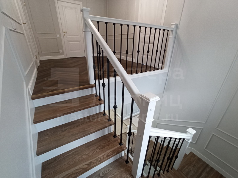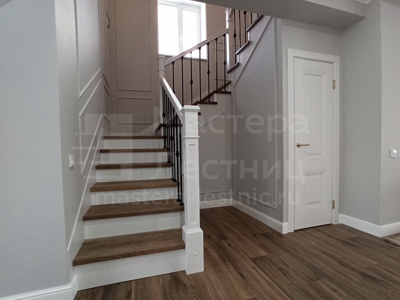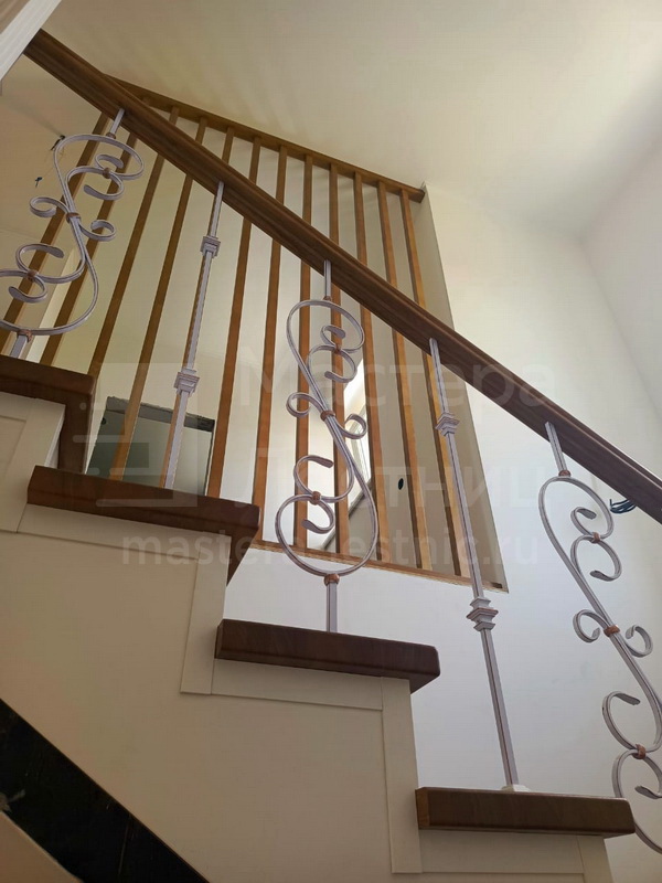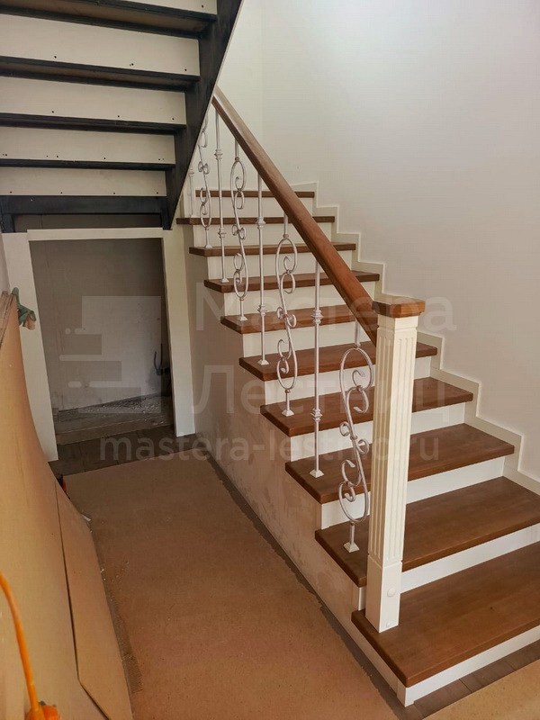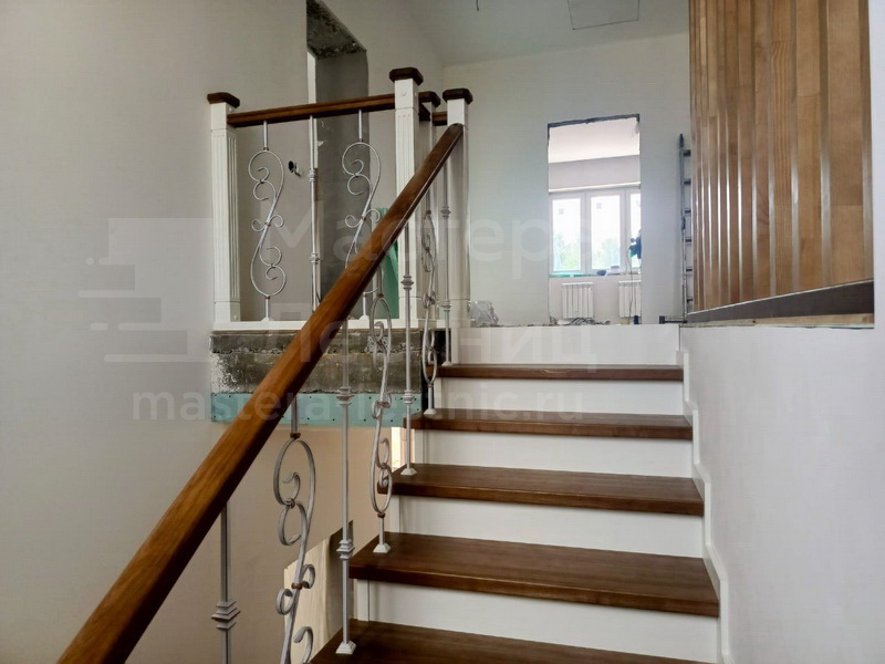 Отделка лестницы деревом с коваными ограждениями